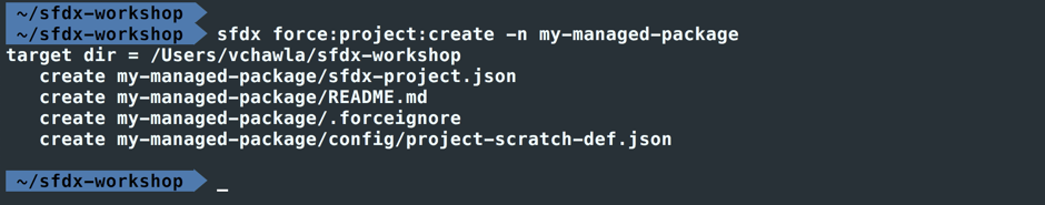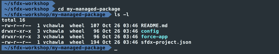 Change into the my-managed-package directory so you can list the files and directories that were just created by the Salesforce CLI.